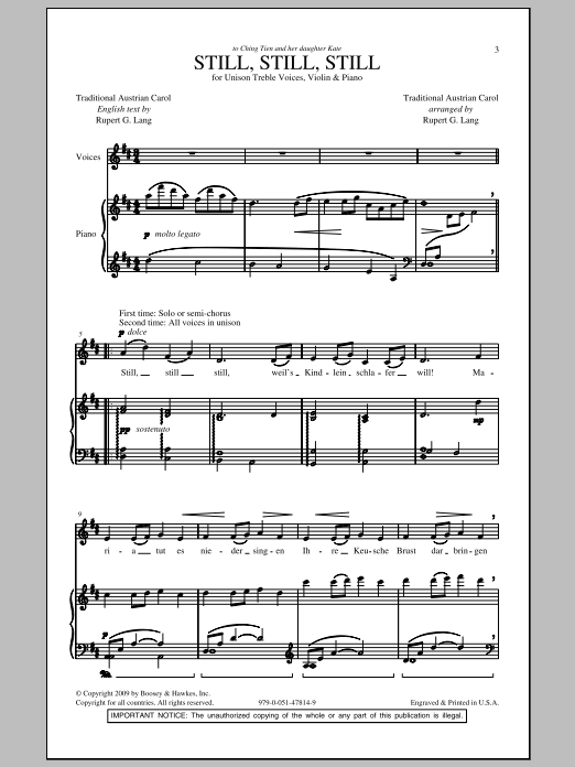 Download or print Rupert Lang Still, Still, Still sheet music, chords and digital score arranged for Unison Choir. This Concert score includes 4 page(s).