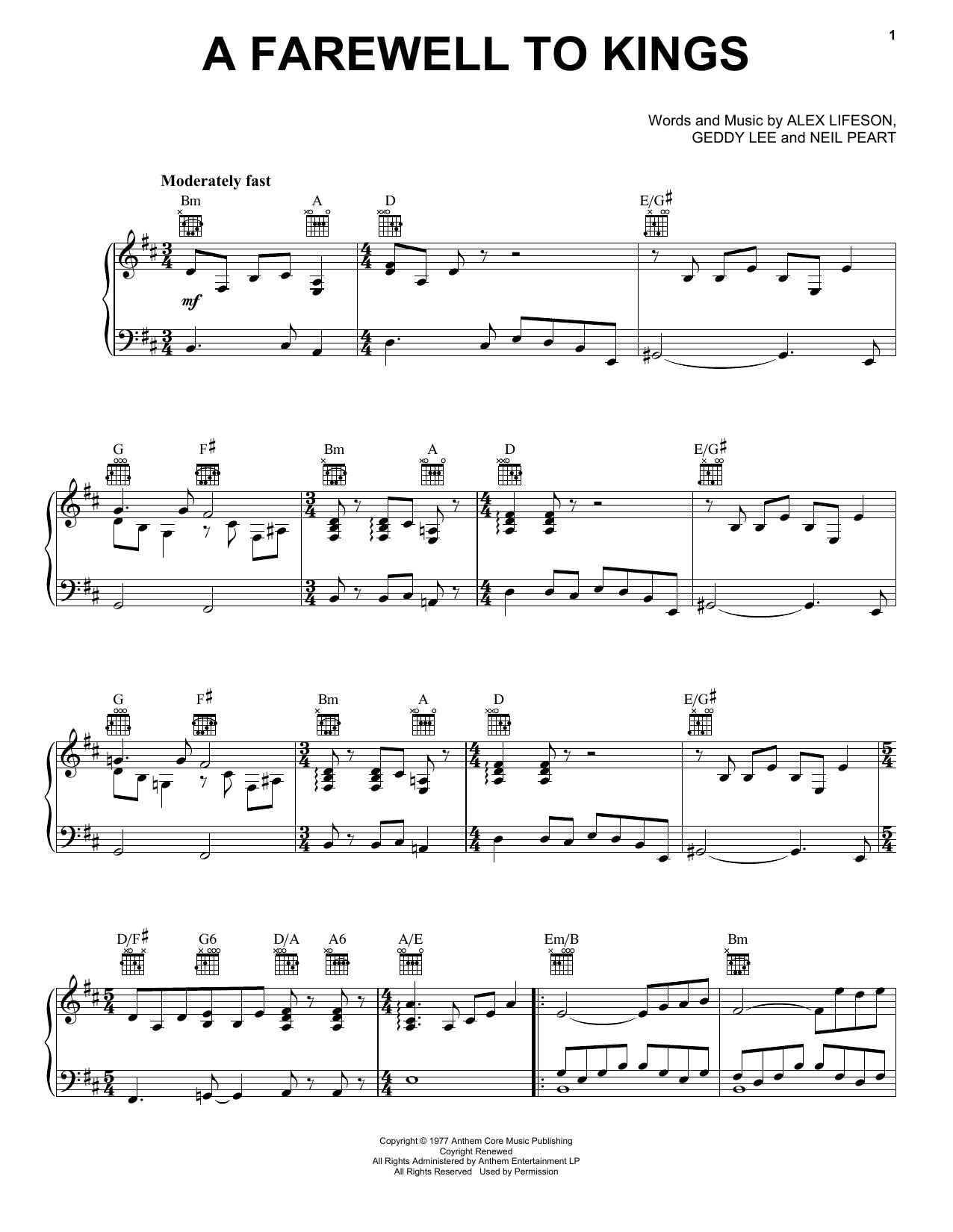 Download or print Rush A Farewell To Kings sheet music, chords and digital score arranged for Piano, Vocal & Guitar Chords (Right-Hand Melody). This Rock score includes 6 page(s).