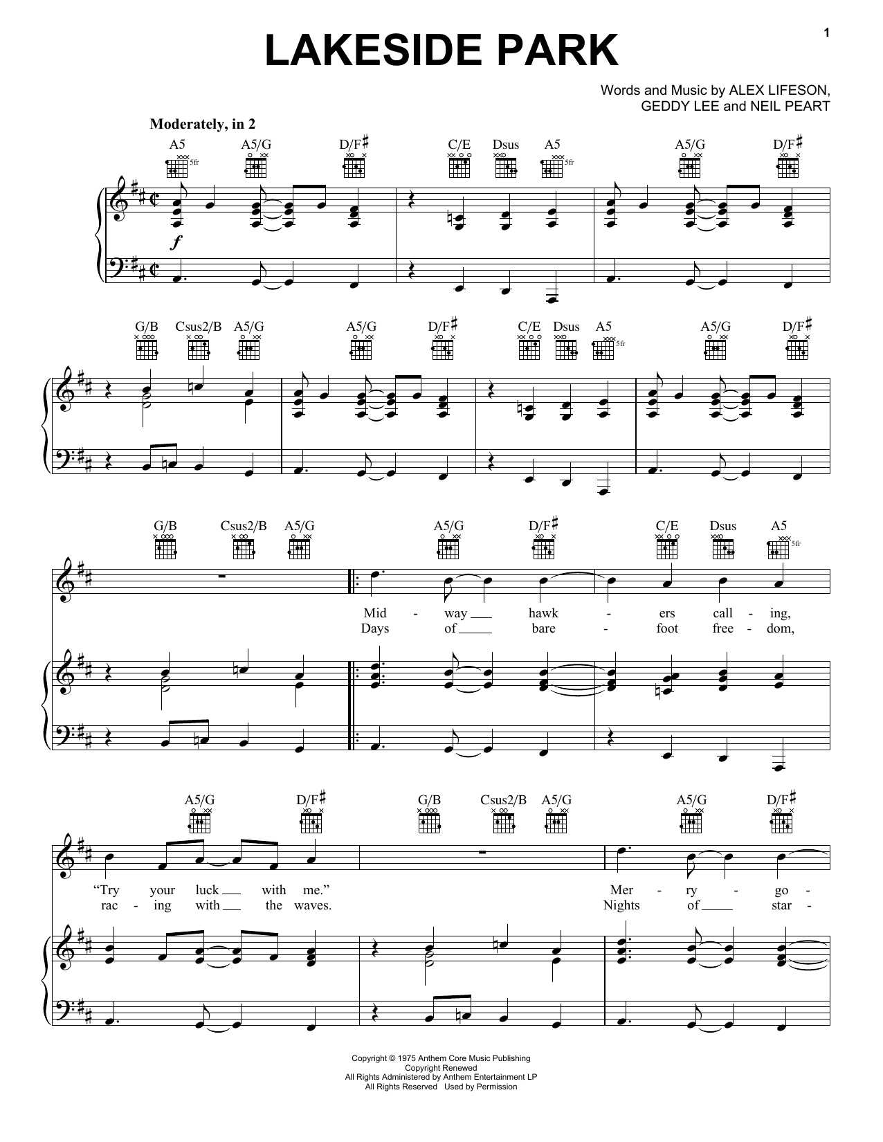 Download or print Rush Lakeside Park sheet music, chords and digital score arranged for Piano, Vocal & Guitar Chords (Right-Hand Melody). This Rock score includes 6 page(s).