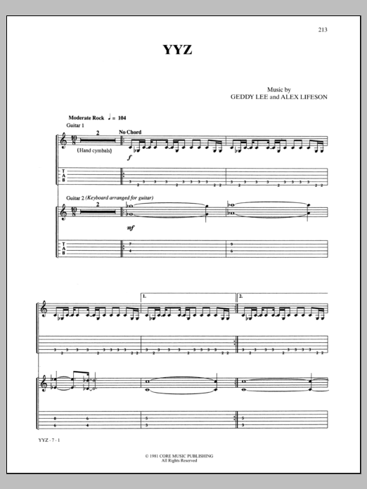 Download or print Rush YYZ sheet music, chords and digital score arranged for Guitar Tab (Single Guitar). This Rock score includes 7 page(s).