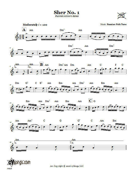 Download or print Russian Folk Tune Sher No. 1 (Russian Scissors Dance) sheet music, chords and digital score arranged for Lead Sheet / Fake Book. This Traditional score includes 2 page(s).