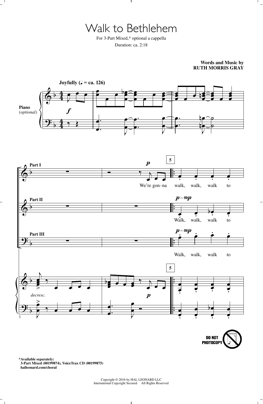 Download or print Ruth Morris Gray Walk To Bethlehem sheet music, chords and digital score arranged for 3-Part Mixed Choir. This Christmas score includes 10 page(s).