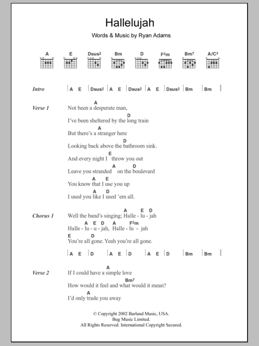 Download or print Ryan Adams Hallelujah sheet music, chords and digital score arranged for Guitar Chords/Lyrics. This Rock score includes 2 page(s).