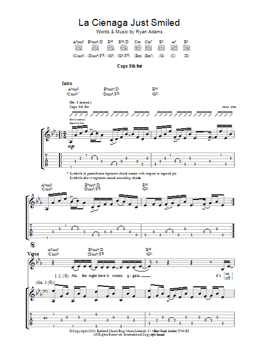 Download or print Ryan Adams La Cienega Just Smiled sheet music, chords and digital score arranged for Guitar Tab. This Rock score includes 7 page(s).