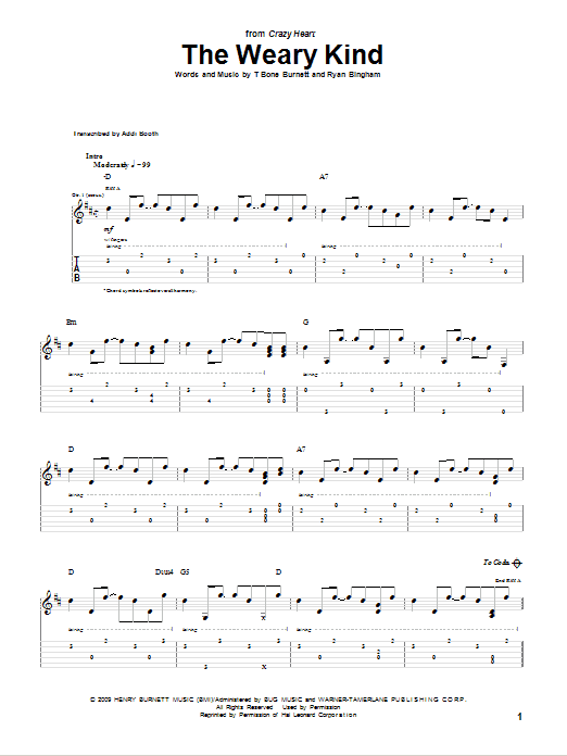 Download or print Ryan Bingham The Weary Kind (Theme From Crazy Heart) sheet music, chords and digital score arranged for Guitar Tab. This Country score includes 7 page(s).