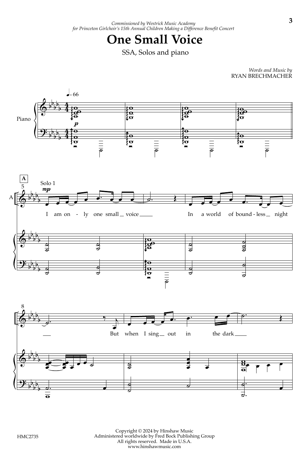 Download or print Ryan Brechmacher One Small Voice sheet music, chords and digital score arranged for SSA Choir. This Concert score includes 10 page(s).