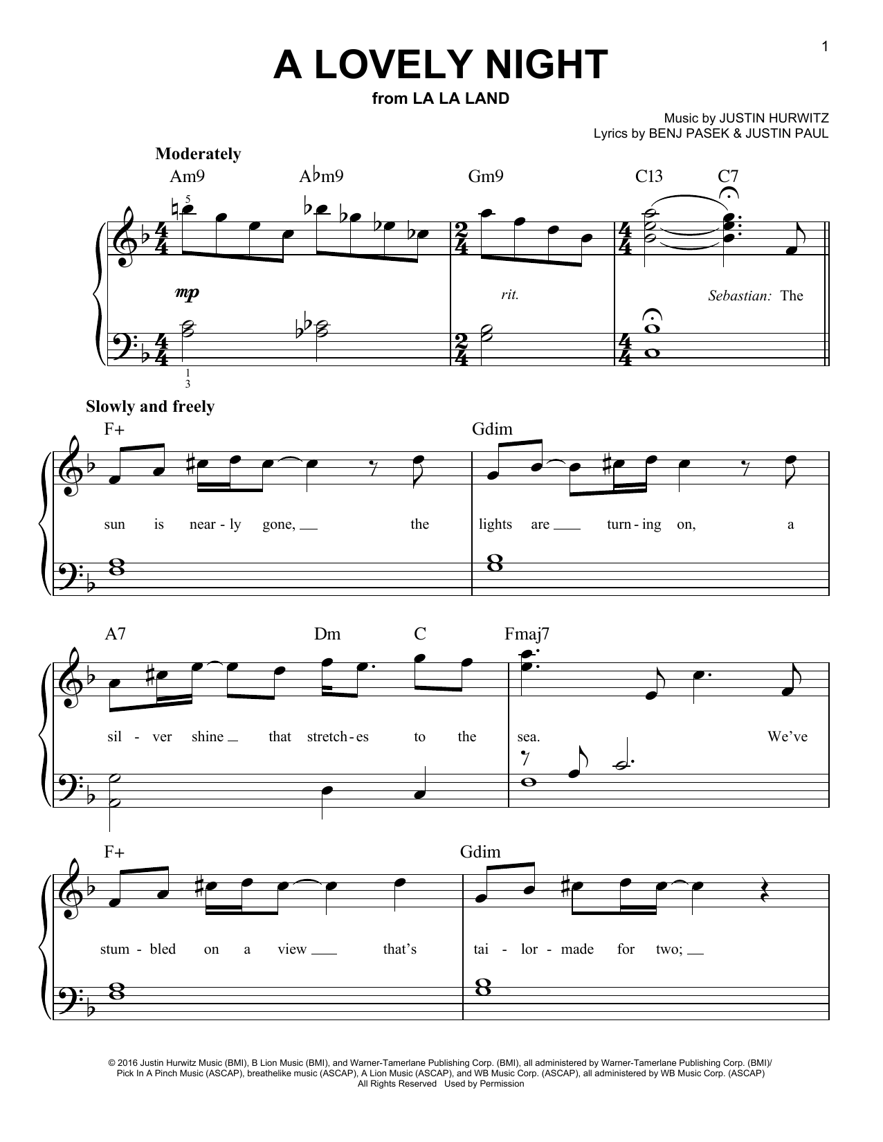 Download or print Ryan Gosling & Emma Stone A Lovely Night (from La La Land) sheet music, chords and digital score arranged for Piano Solo. This Film/TV score includes 4 page(s).
