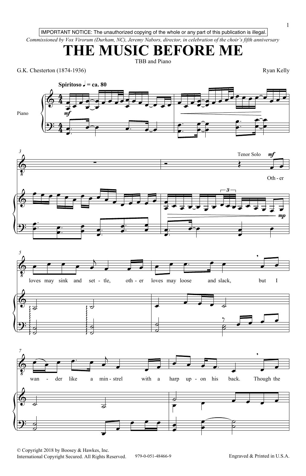 Download or print Ryan Kelly The Music Before Me sheet music, chords and digital score arranged for TBB Choir. This Concert score includes 18 page(s).