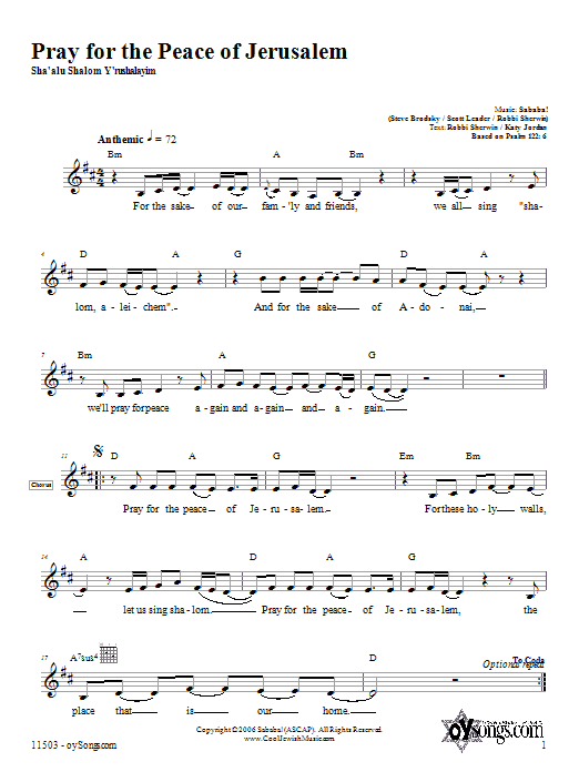 Download or print Sababa Pray for the Peace of Jerusalem sheet music, chords and digital score arranged for Lead Sheet / Fake Book. This Traditional score includes 2 page(s).
