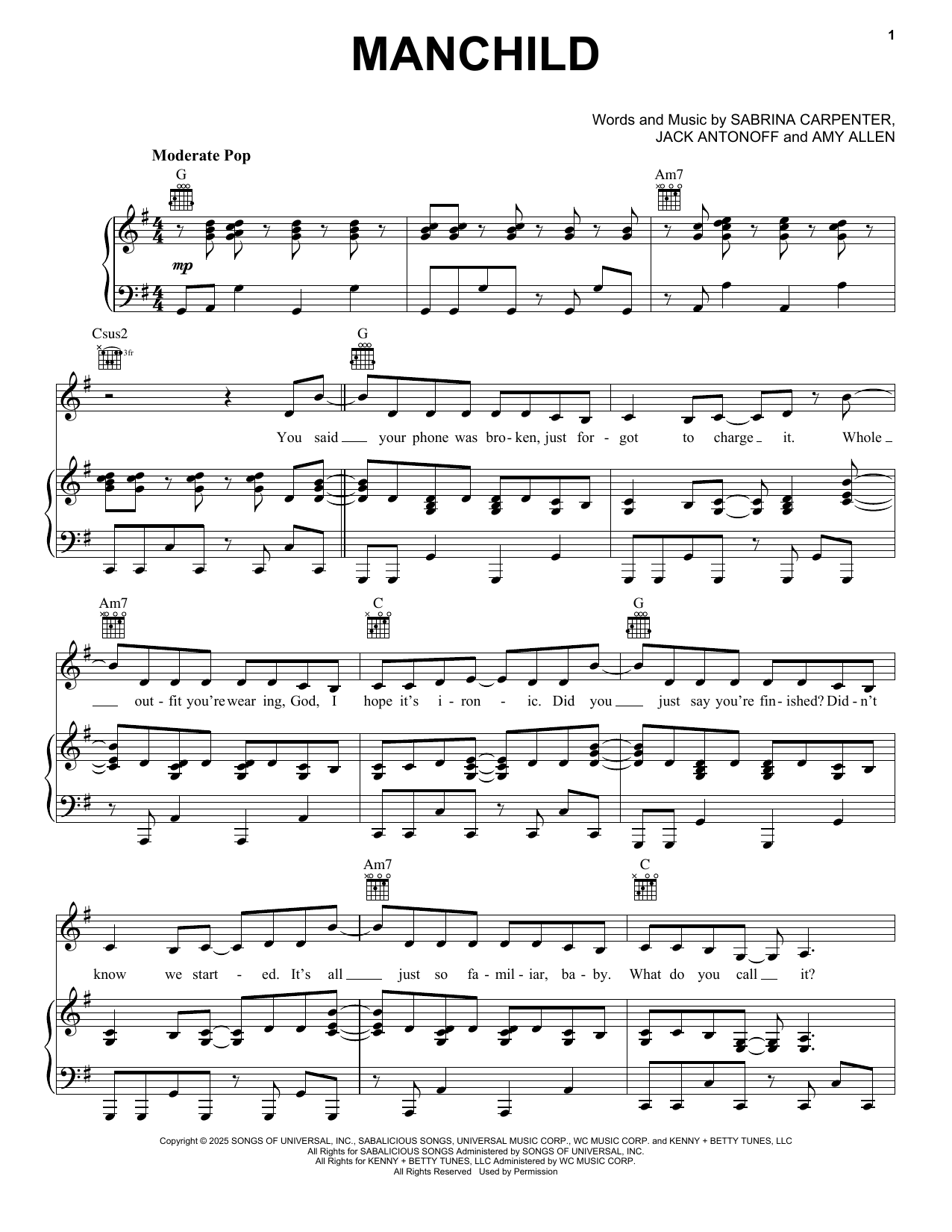 Download or print Sabrina Carpenter Manchild sheet music, chords and digital score arranged for Super Easy Piano. This Country score includes 2 page(s).