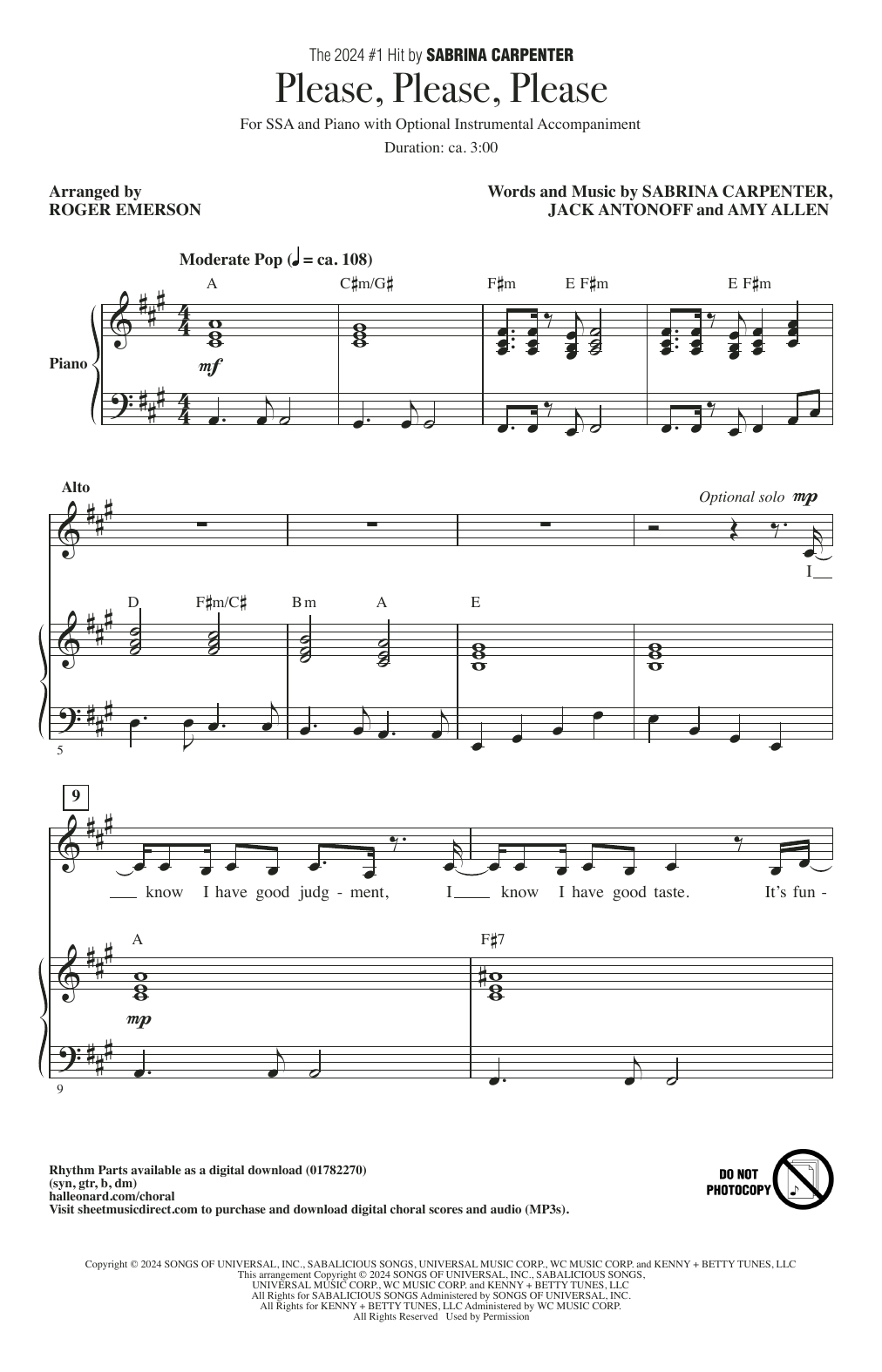 Download or print Sabrina Carpenter Please Please Please (arr. Roger Emerson) sheet music, chords and digital score arranged for SSA Choir. This Pop score includes 10 page(s).