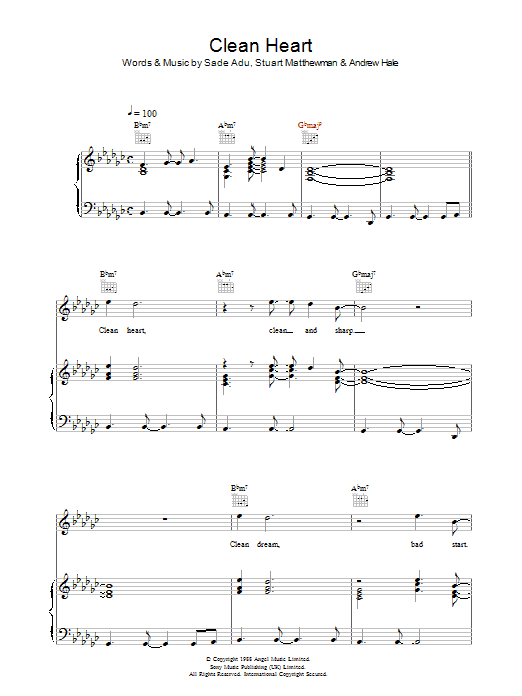 Download or print Sade Clean Heart sheet music, chords and digital score arranged for Piano, Vocal & Guitar Chords. This Pop score includes 8 page(s).