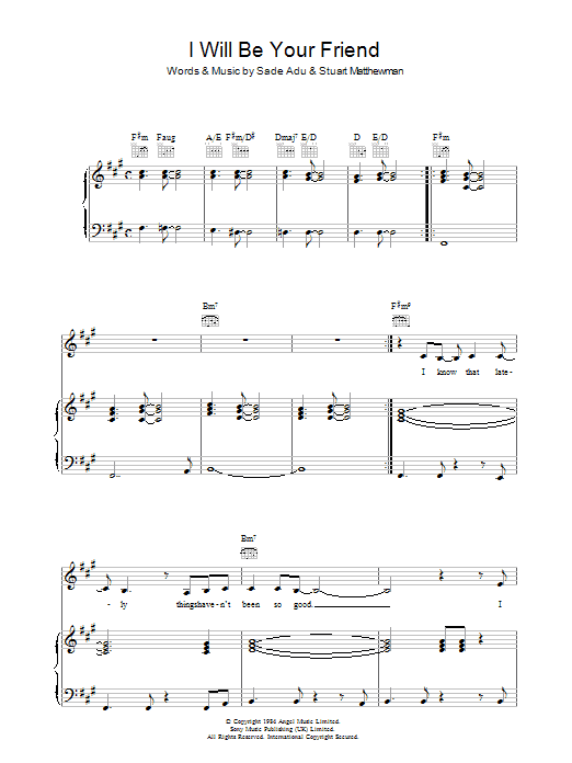 Download or print Sade I Will Be Your Friend sheet music, chords and digital score arranged for Piano, Vocal & Guitar Chords. This Pop score includes 9 page(s).