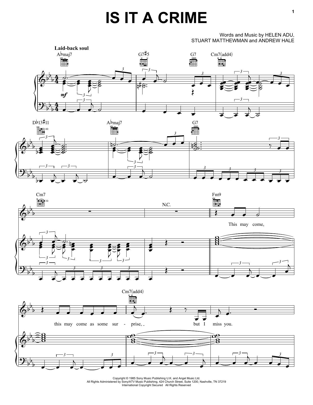 Download or print Sade Is It A Crime sheet music, chords and digital score arranged for Piano, Vocal & Guitar Chords (Right-Hand Melody). This Pop score includes 5 page(s).
