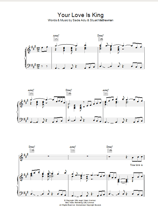 Download or print Sade Your Love Is King sheet music, chords and digital score arranged for Piano, Vocal & Guitar Chords. This Love score includes 6 page(s).