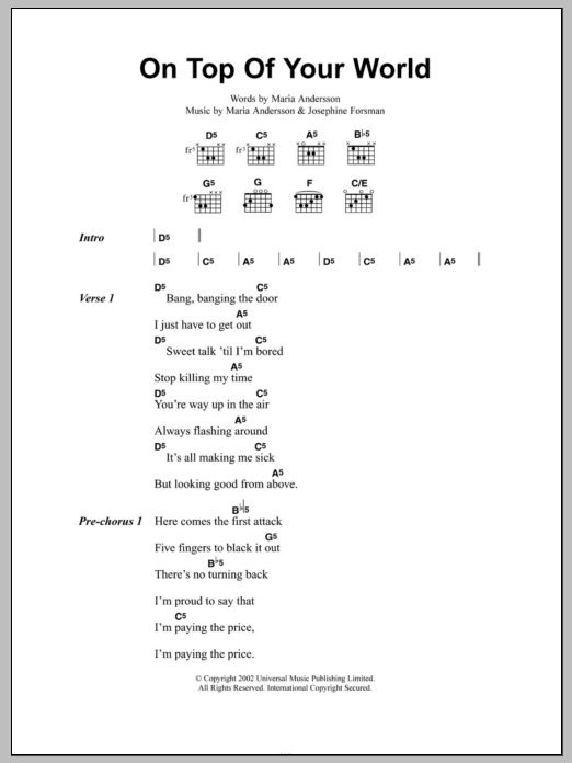 Download or print Sahara Hotnights On Top Of Your World sheet music, chords and digital score arranged for Guitar Chords/Lyrics. This Rock score includes 3 page(s).