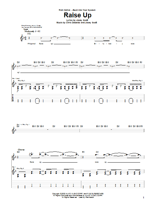 Download or print Saliva Raise Up sheet music, chords and digital score arranged for Guitar Tab. This Metal score includes 8 page(s).