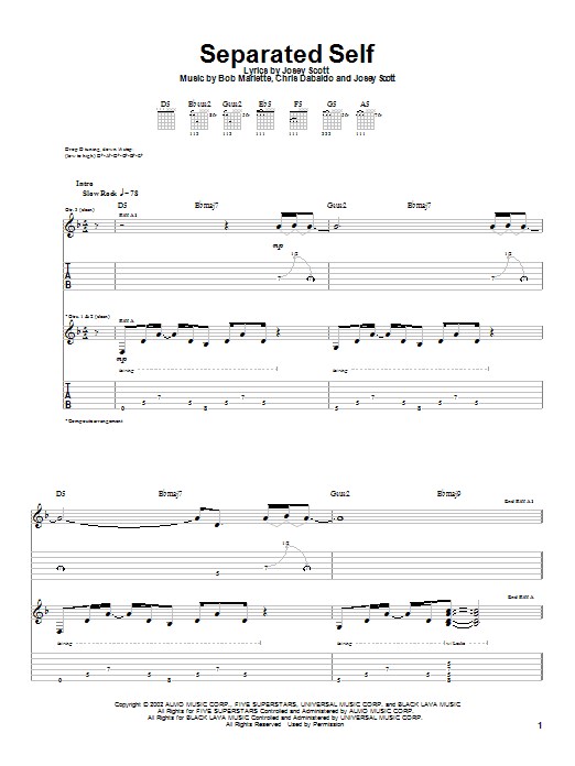 Download or print Saliva Separated Self sheet music, chords and digital score arranged for Guitar Tab. This Metal score includes 8 page(s).