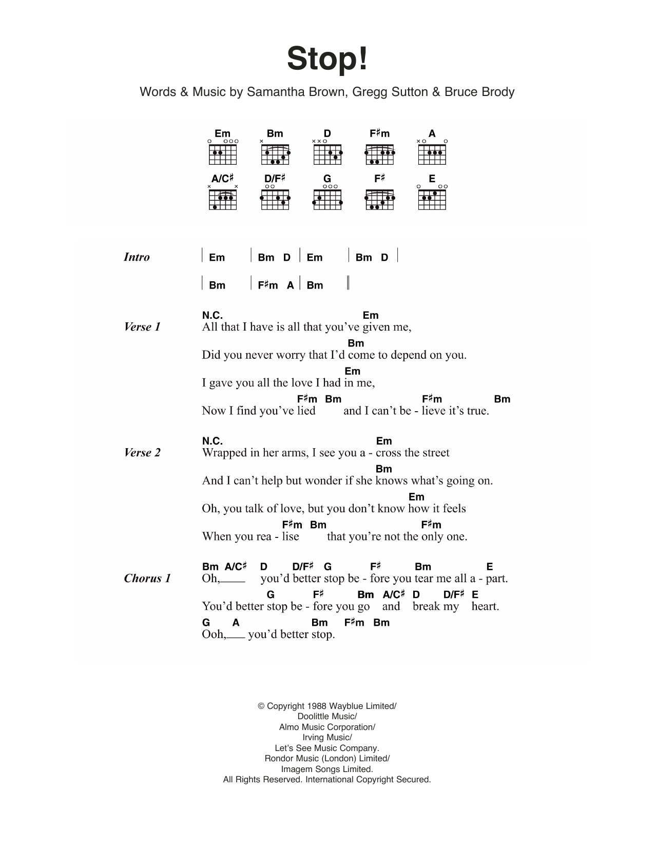 Download or print Sam Brown Stop! sheet music, chords and digital score arranged for Guitar Chords/Lyrics. This Pop score includes 3 page(s).