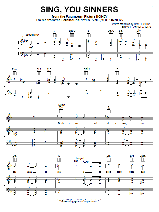 Download or print Sam Coslow Sing, You Sinners sheet music, chords and digital score arranged for Piano, Vocal & Guitar Chords (Right-Hand Melody). This Jazz score includes 5 page(s).