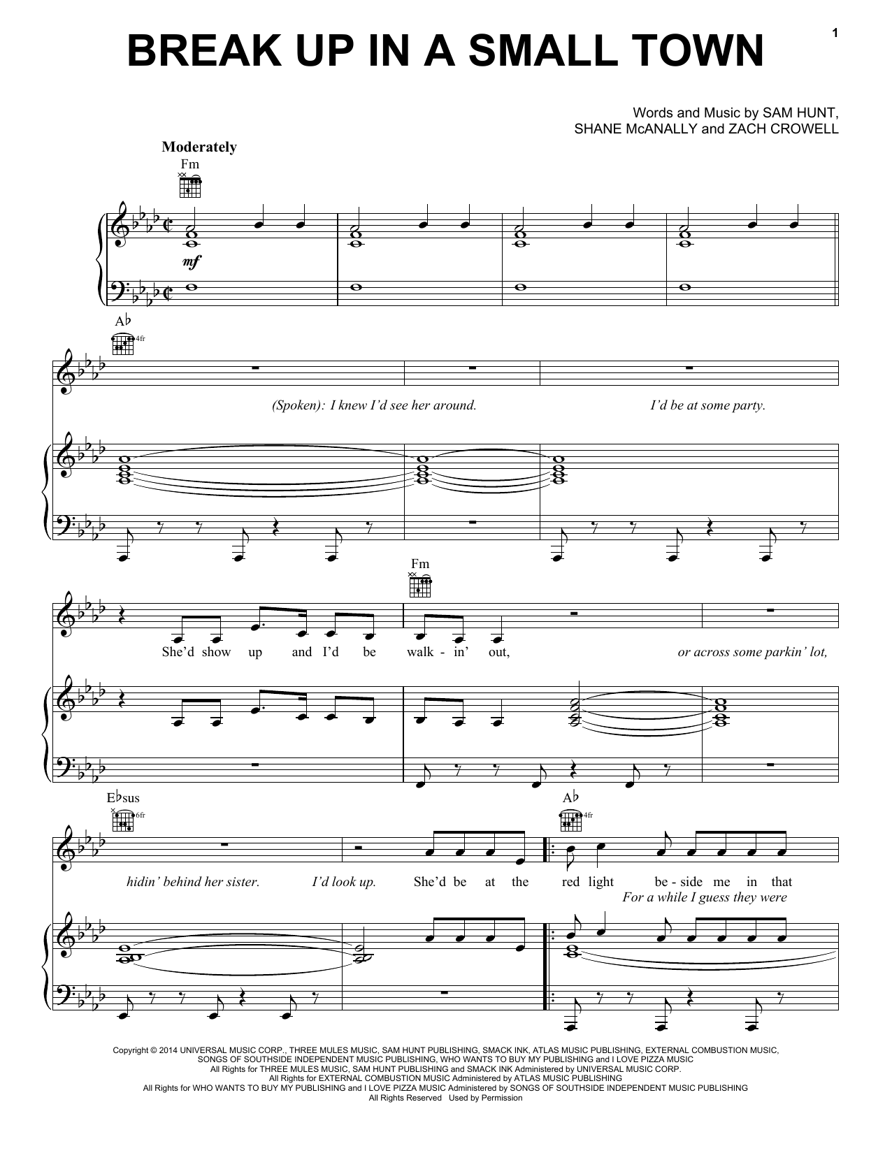Download or print Sam Hunt Break Up In A Small Town sheet music, chords and digital score arranged for Piano, Vocal & Guitar Chords (Right-Hand Melody). This Country score includes 7 page(s).