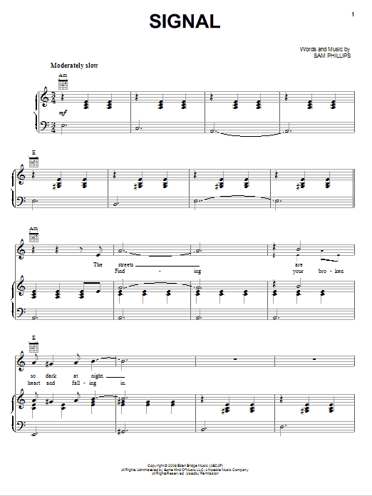 Download or print Sam Phillips Signal sheet music, chords and digital score arranged for Piano, Vocal & Guitar Chords (Right-Hand Melody). This Pop score includes 5 page(s).