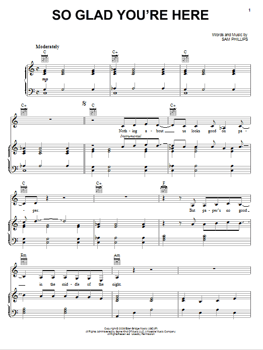 Download or print Sam Phillips So Glad You're Here sheet music, chords and digital score arranged for Piano, Vocal & Guitar Chords (Right-Hand Melody). This Pop score includes 4 page(s).