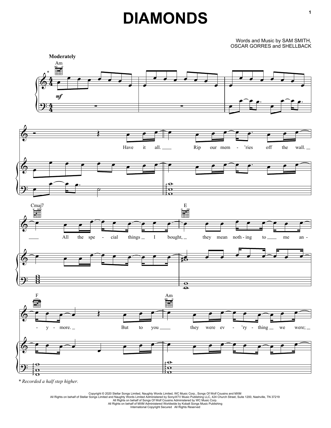 Download or print Sam Smith Diamonds sheet music, chords and digital score arranged for Easy Piano. This Pop score includes 7 page(s).