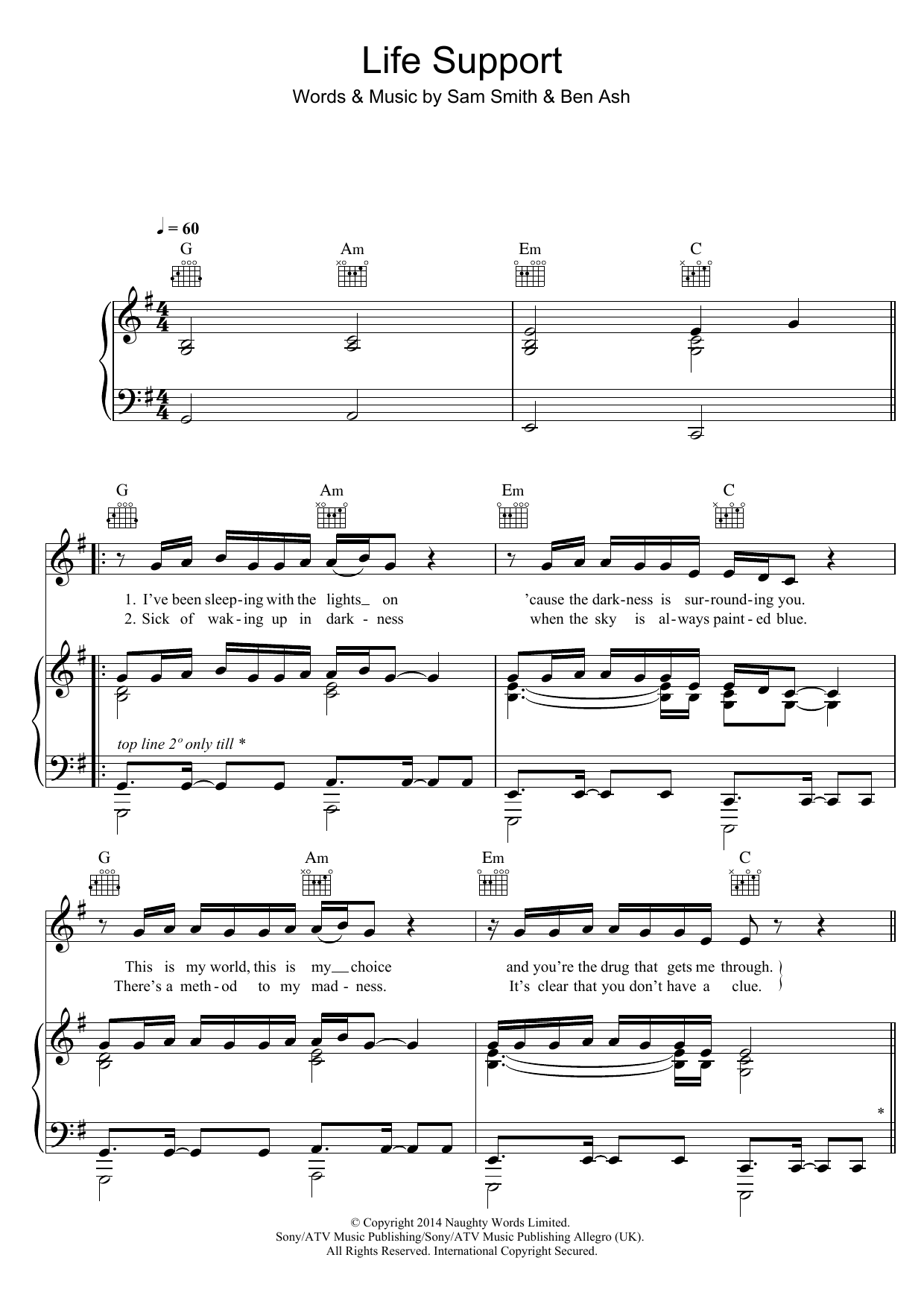 Download or print Sam Smith Life Support sheet music, chords and digital score arranged for Piano, Vocal & Guitar Chords (Right-Hand Melody). This Pop score includes 4 page(s).