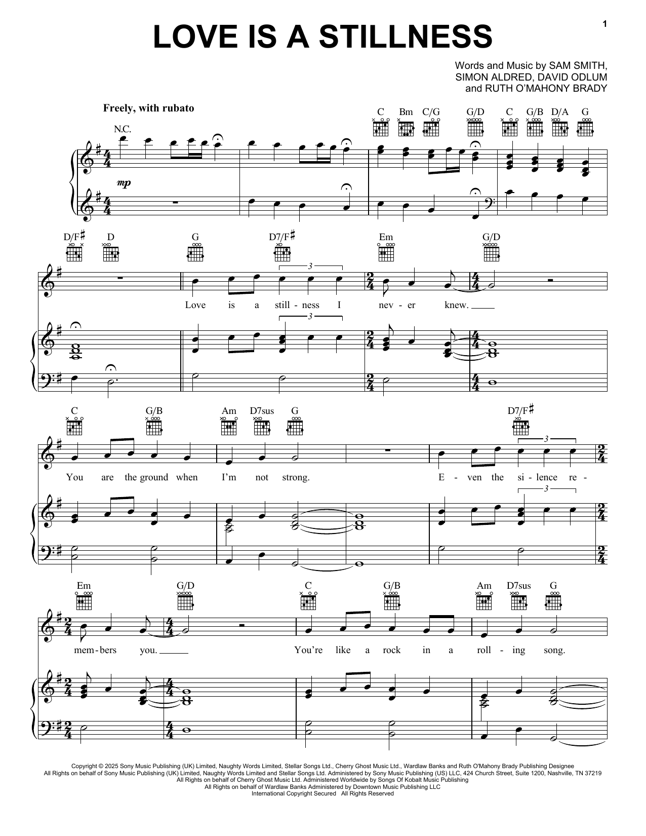 Download or print Sam Smith Love Is A Stillness sheet music, chords and digital score arranged for Piano, Vocal & Guitar Chords (Right-Hand Melody). This Pop score includes 3 page(s).