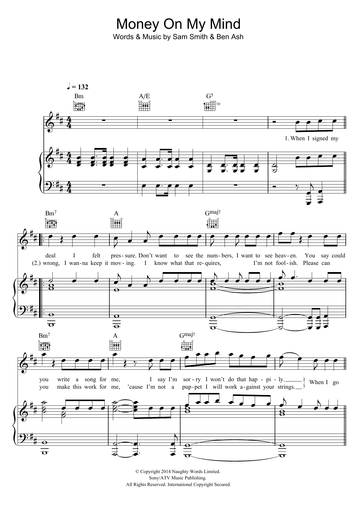 Download or print Sam Smith Money On My Mind sheet music, chords and digital score arranged for Easy Piano. This Pop score includes 5 page(s).