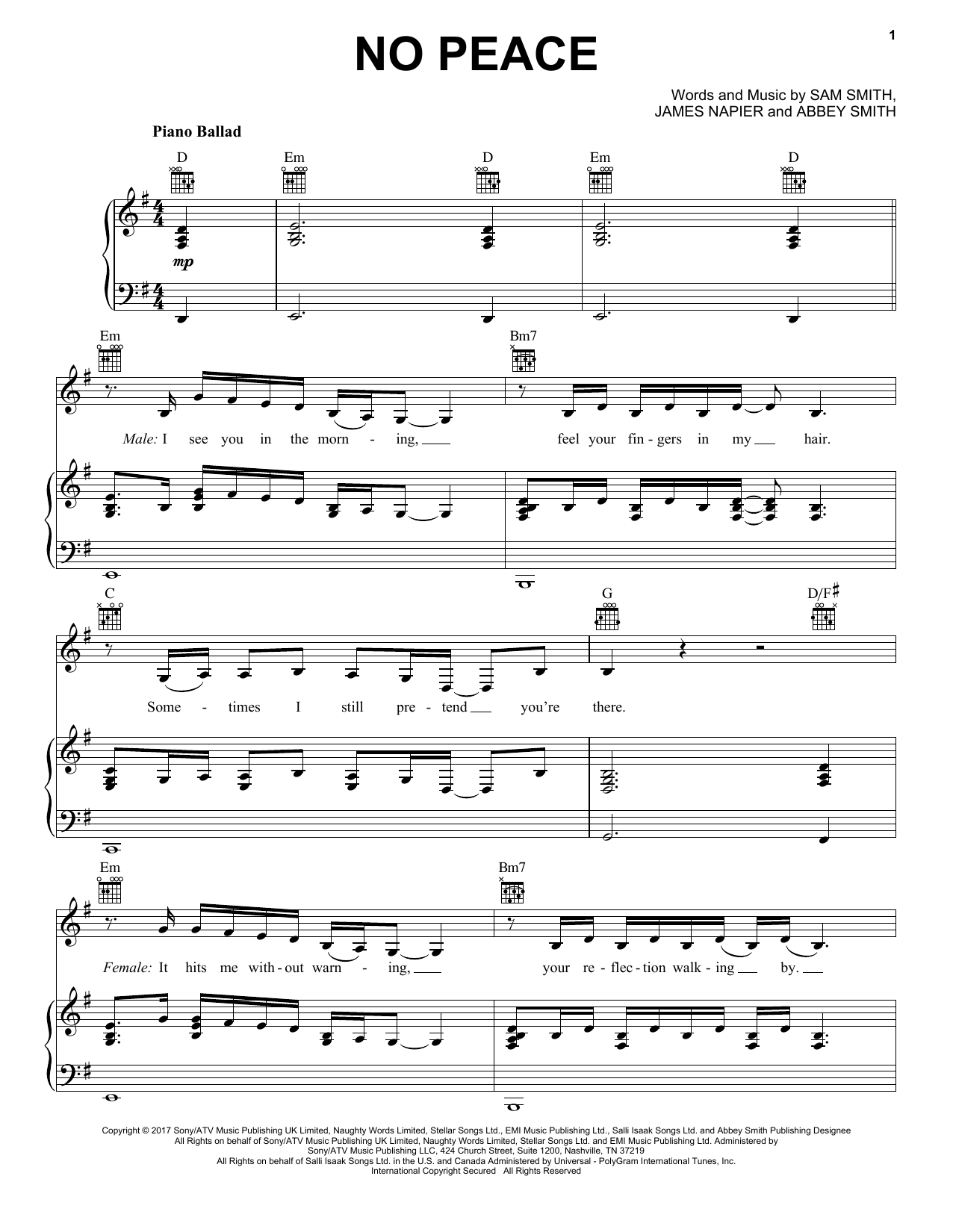 Download or print Sam Smith No Peace (feat. YEBBA) sheet music, chords and digital score arranged for Easy Piano. This Pop score includes 7 page(s).