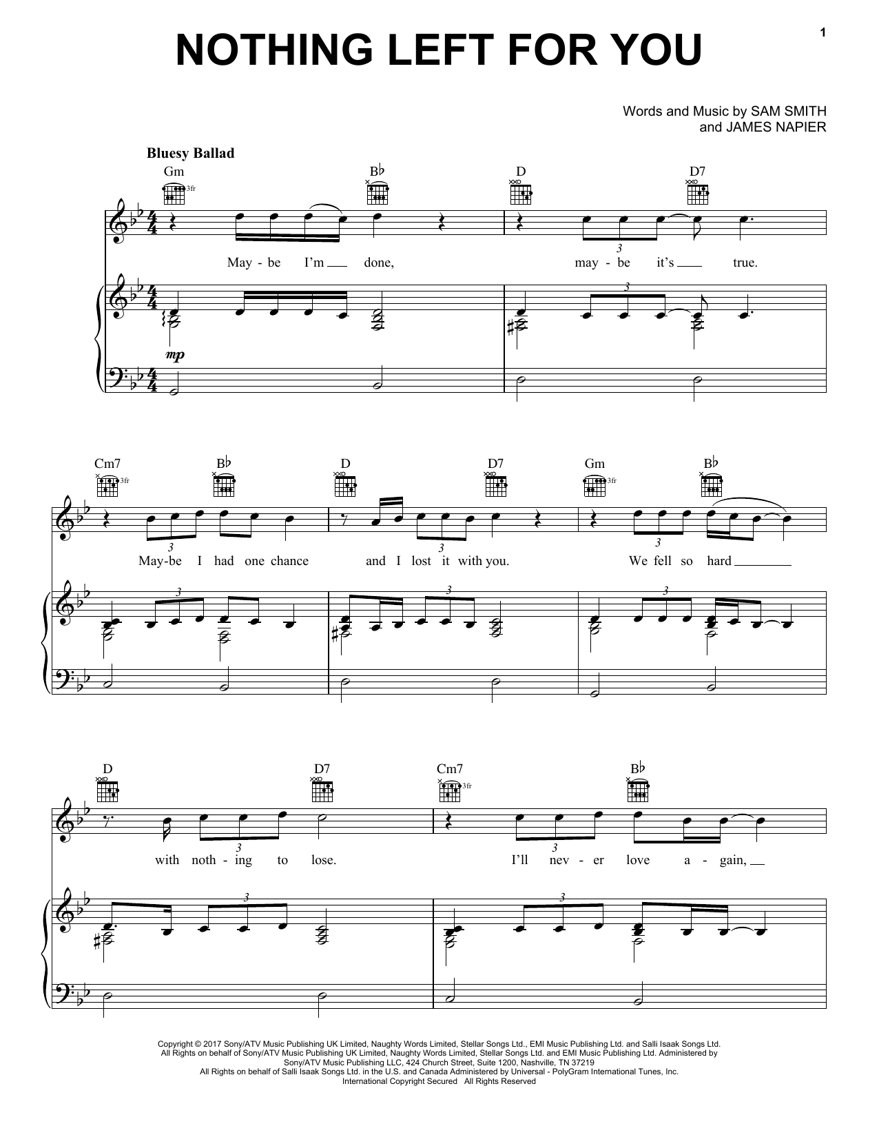 Download or print Sam Smith Nothing Left For You sheet music, chords and digital score arranged for Piano, Vocal & Guitar Chords (Right-Hand Melody). This Pop score includes 7 page(s).