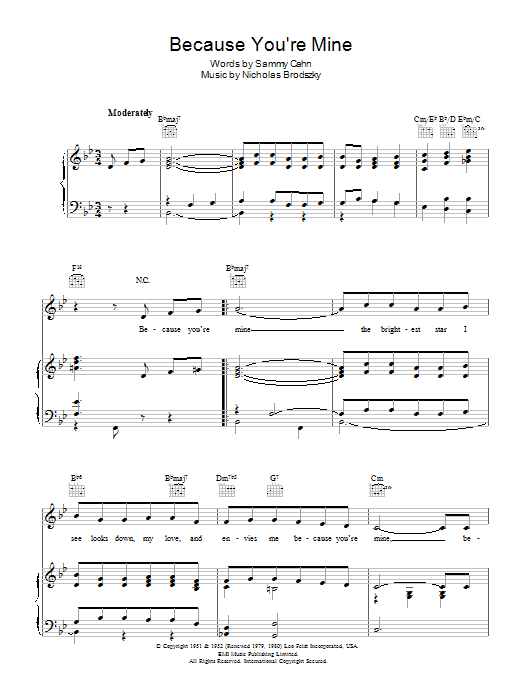 Download or print Sammy Cahn Because You're Mine sheet music, chords and digital score arranged for Piano, Vocal & Guitar Chords. This Standards score includes 4 page(s).