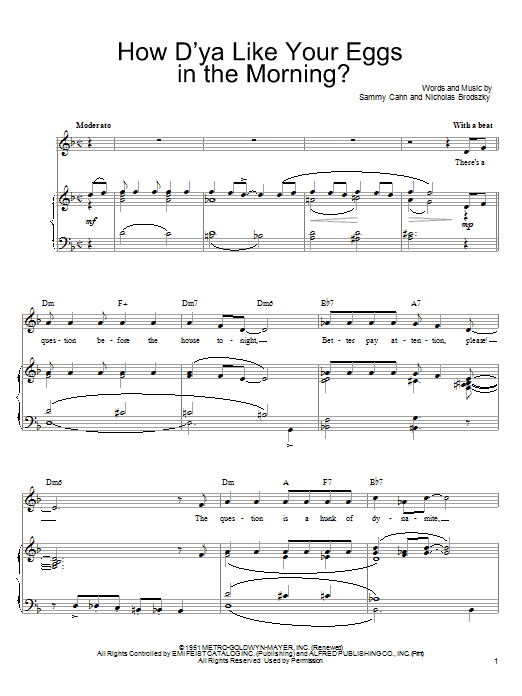 Download or print Sammy Cahn How D'ya Like Your Eggs In The Morning? sheet music, chords and digital score arranged for Easy Piano. This Musical/Show score includes 4 page(s).