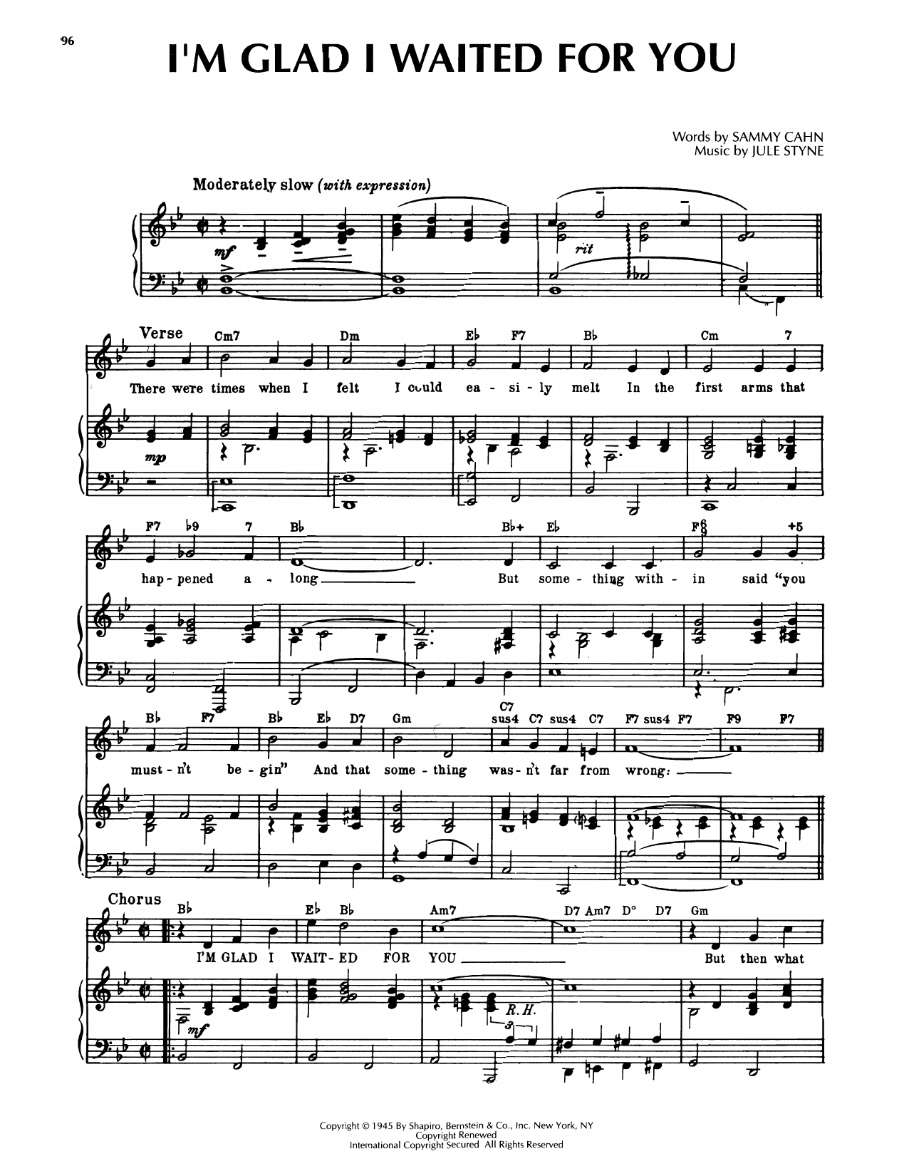 Download or print Sammy Cahn & Jule Styne I'm Glad I Waited For You (from Tars And Spars) sheet music, chords and digital score arranged for Piano & Vocal. This Film/TV score includes 2 page(s).