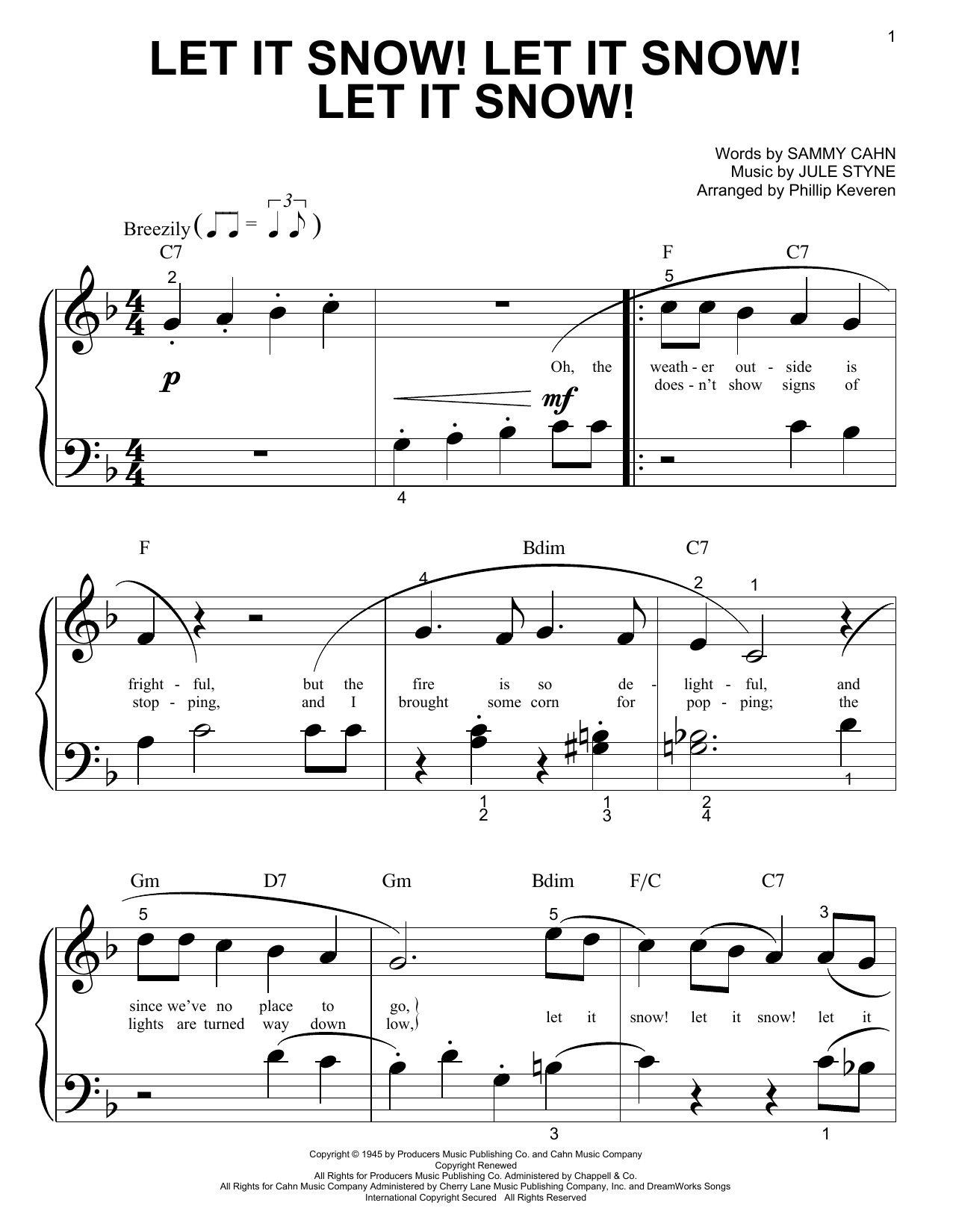 Download or print Sammy Cahn Let It Snow! Let It Snow! Let It Snow! (arr. Phillip Keveren) sheet music, chords and digital score arranged for Big Note Piano. This Children score includes 3 page(s).