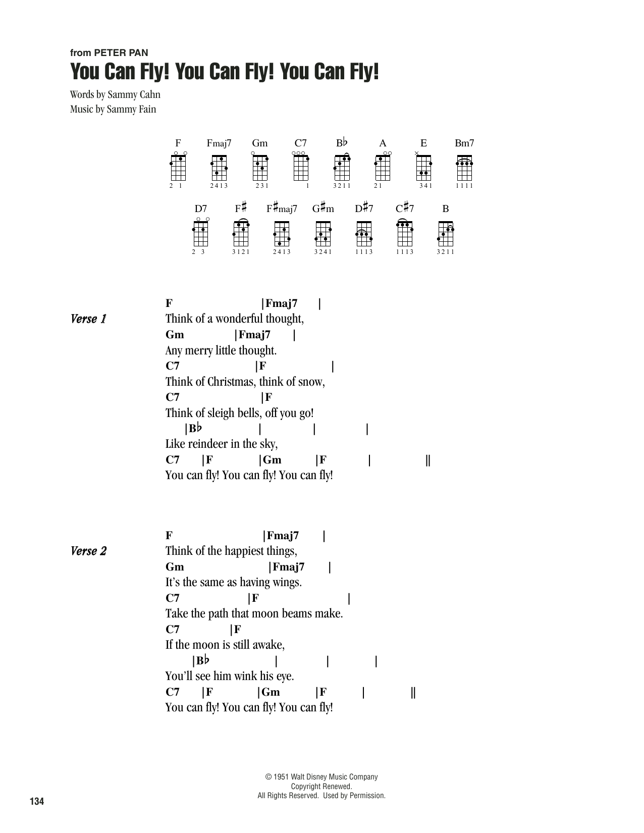 Download or print Sammy Cahn You Can Fly! You Can Fly! You Can Fly! sheet music, chords and digital score arranged for Ukulele Chords/Lyrics. This Disney score includes 2 page(s).