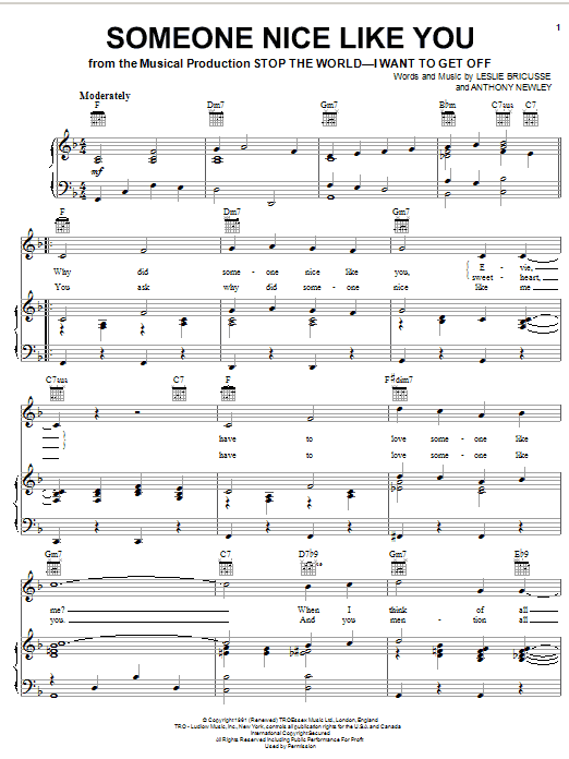 Download or print Leslie Bricusse Someone Nice Like You sheet music, chords and digital score arranged for Piano, Vocal & Guitar Chords. This Musical/Show score includes 3 page(s).