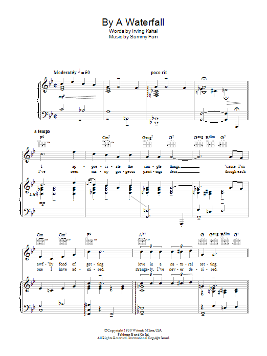 Download or print Sammy Fain By A Waterfall sheet music, chords and digital score arranged for Piano, Vocal & Guitar Chords. This Standards score includes 5 page(s).