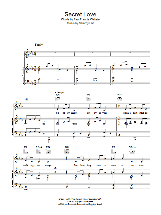 Download or print Sammy Fain Secret Love sheet music, chords and digital score arranged for Easy Lead Sheet / Fake Book. This Jazz score includes 1 page(s).