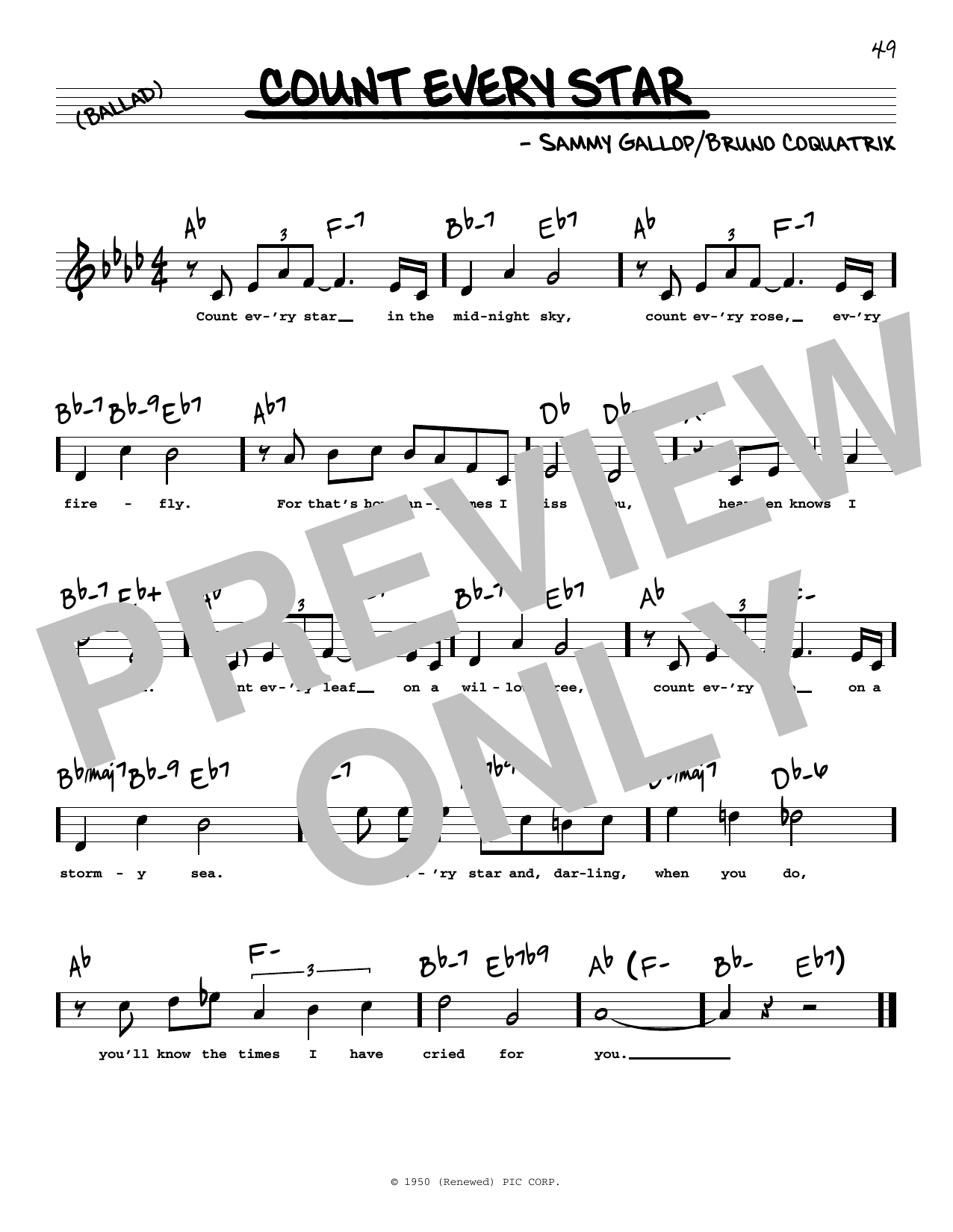 Download or print Sammy Gallop Count Every Star (High Voice) sheet music, chords and digital score arranged for Real Book – Melody, Lyrics & Chords. This Jazz score includes 1 page(s).