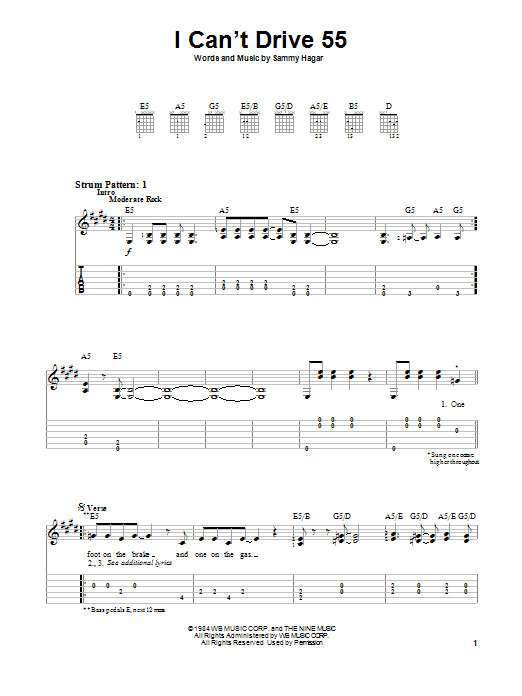 Download or print Sammy Hagar I Can't Drive 55 sheet music, chords and digital score arranged for Guitar Tab. This Rock score includes 10 page(s).