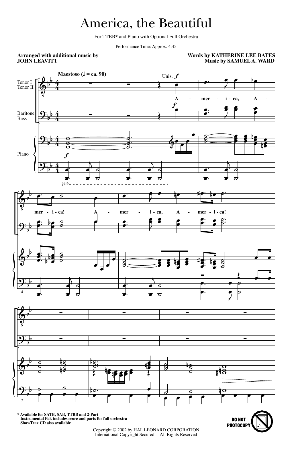 Download or print Samuel A. Ward America, The Beautiful (arr. John Leavitt) sheet music, chords and digital score arranged for SAB Choir. This Patriotic score includes 11 page(s).