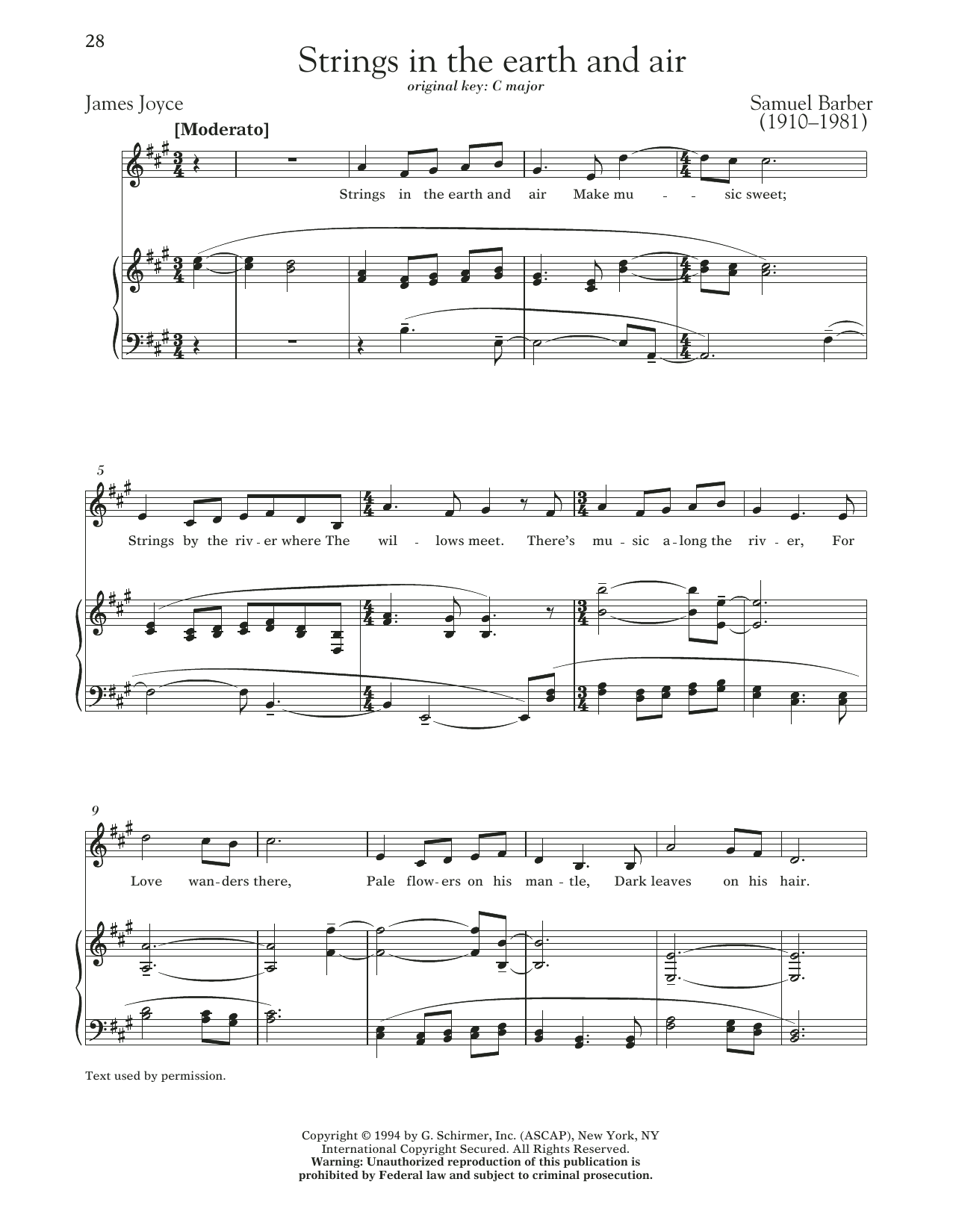 Download or print Samuel Barber Strings In The Earth And Air sheet music, chords and digital score arranged for Piano & Vocal. This Classical score includes 2 page(s).