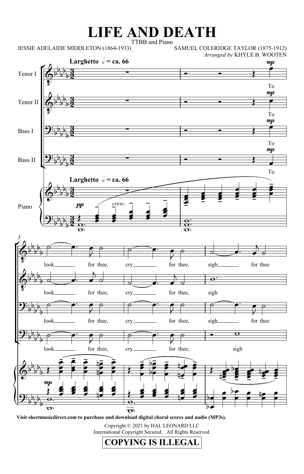 Download or print Samuel Coleridge Taylor Life And Death (arr. Khyle B. Wooten) sheet music, chords and digital score arranged for TTBB Choir. This Concert score includes 6 page(s).