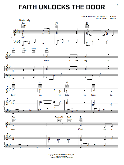 Download or print Samuel T. Scott Faith Unlocks The Door sheet music, chords and digital score arranged for Piano, Vocal & Guitar Chords (Right-Hand Melody). This Country score includes 3 page(s).