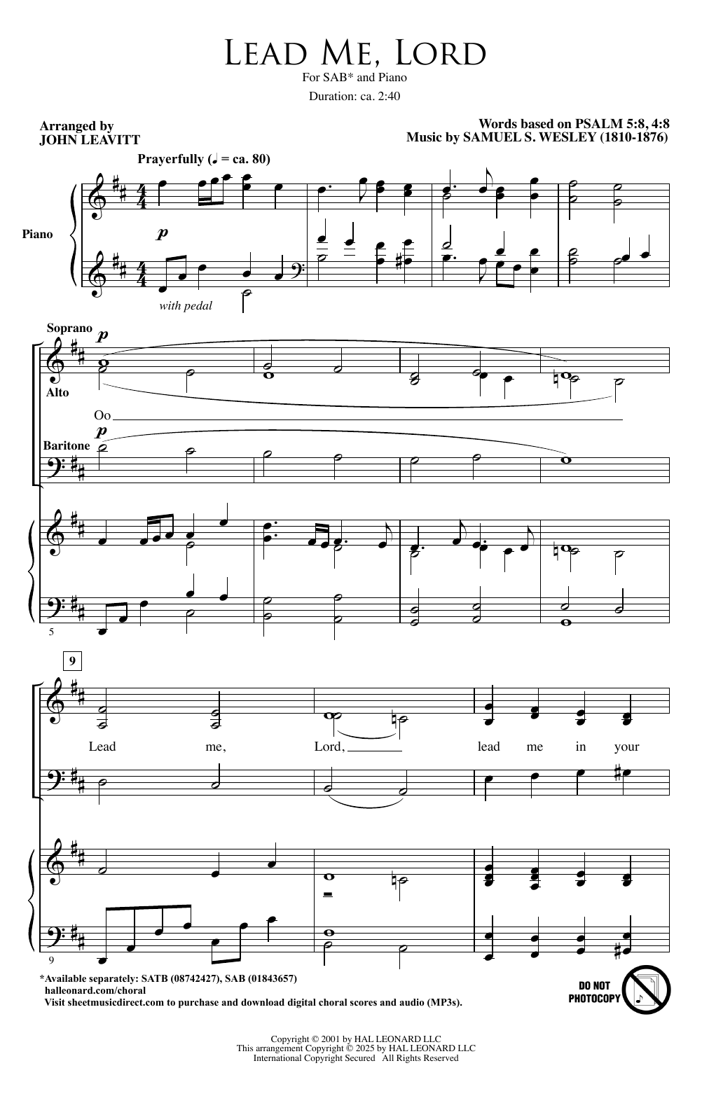 Download or print Samuel Wesley Lead Me, Lord (arr. John Leavitt) sheet music, chords and digital score arranged for SAB Choir. This Lent score includes 5 page(s).
