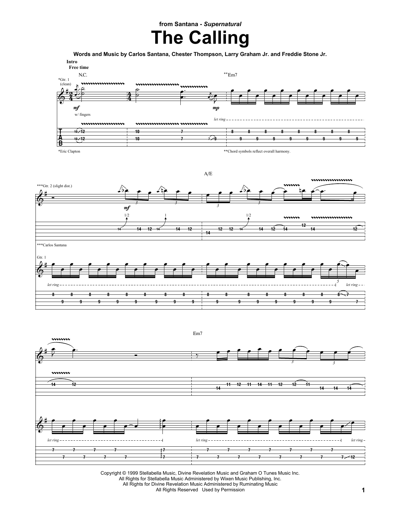 Download or print Santana featuring Eric Clapton The Calling sheet music, chords and digital score arranged for Guitar Tab. This Latin score includes 24 page(s).