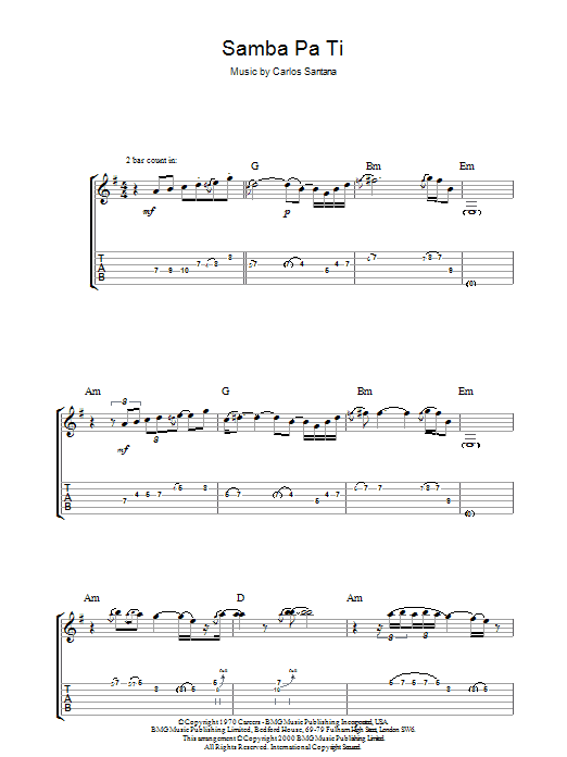 Download or print Santana Samba Pa Ti sheet music, chords and digital score arranged for Guitar Tab. This Pop score includes 10 page(s).